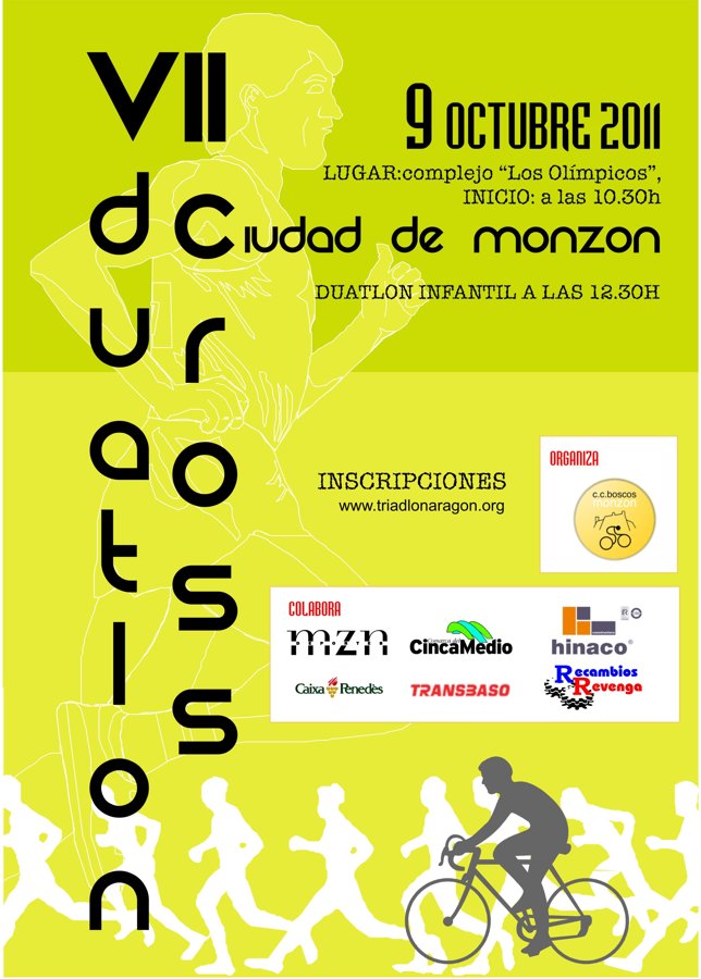 De la mano del C.C. Boscos el próximo domingo, 9 de octubre, se celebrará el VII Duatlón Cros Ciudad de Monzón. La prueba comenzará a partir de las 10:30h en el complejo "Los Olímpicos". Los participantes tendrán que recorrer 6km de carrera a pie, 18 de ciclismo en btt y 2km de carrera a pie.