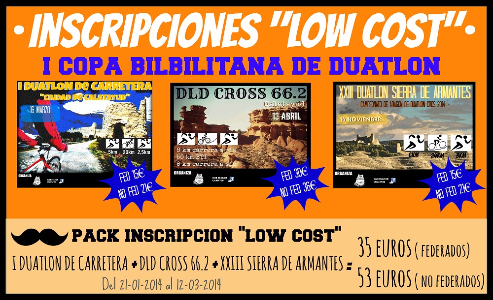 Ultimas horas para apuntarse al PACK LOW COAST CALATAYUD si te apuntas en el tendrás la inscripción de los tres duatlones realizados en CALATAYUD por un precio realmente espectacular no llega a 12 € por duatlón incluido el de larga distancia. Este pack está limitado a 100 personas y la fecha de finalización de la oferta es el miércoles 12 de marzo. En ellos se ofrecen los servicios que habitualmente se dan en las pruebas de Calatayud. Bolsa de corredor, duchas agua caliente, barra libre de liquido y solido después de la prueba y en las dos pruebas finales la popular judiada para reponernos de los esfuerzos. Si quieres probar con un duatlón de carretera distancia sprint aquí está tu oportunidad , sobre unos circuitos sin ningún tipo de dificultad puede ser tu primer duatlón. Circuito a pie con un desnivel de apenas 5 metros y en el circuito de carretera apenas 20 metros de desnivel, la carretera permanecerá cerrada al trafico. Ahh y el tiempo que nos viene para esta ocasión es ideal para la practica deportiva. Con respecto a los demás duatlones daremos información conforme llegue la fecha.