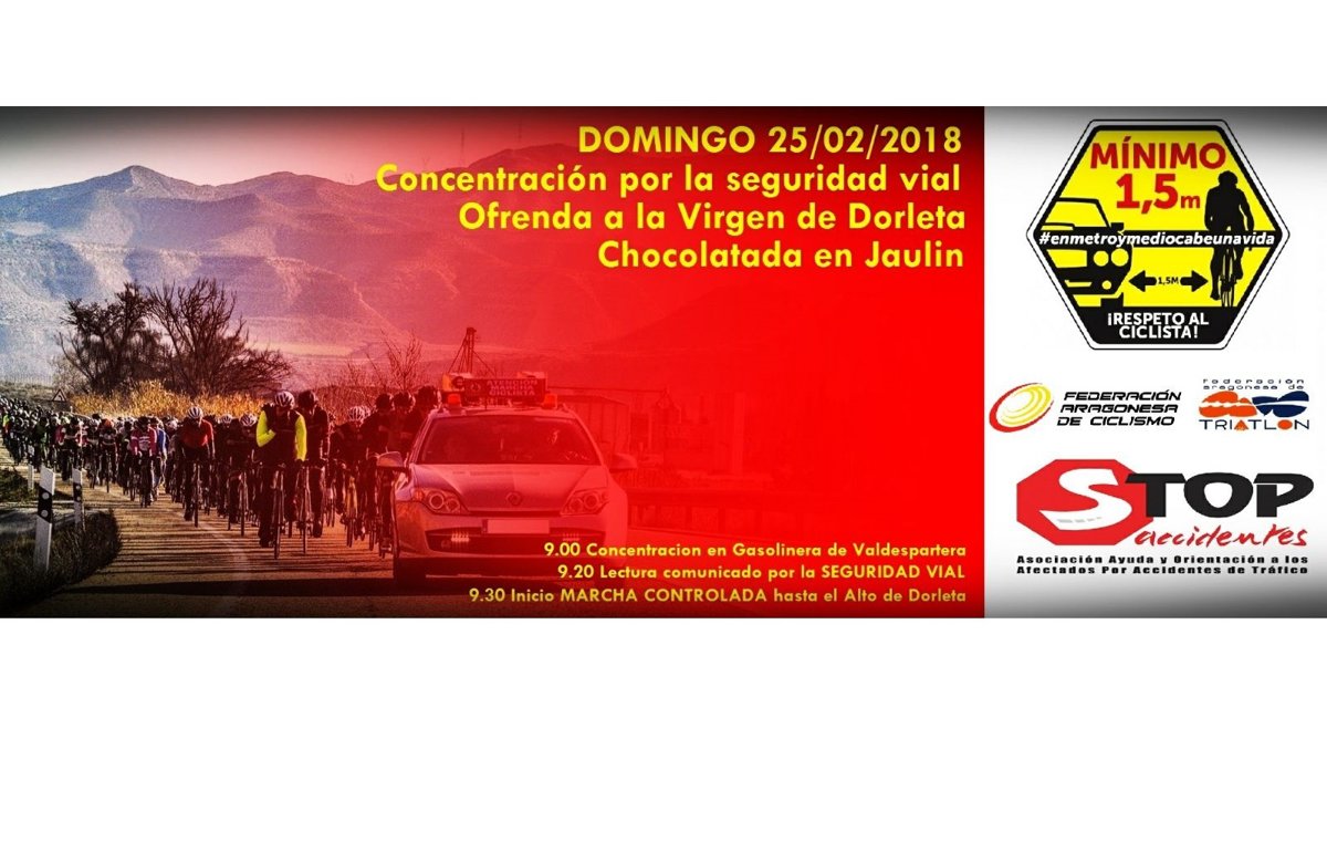 La FEDERACION ARAGONESA DE CICLISMO, La FEDERACION ARAGONESA DE TRIATLÓN, Los CLUBES CICLISTAS que suscriben, y La Organización STOP ACCIDENTES DE ARAGÓN, han convocado para el domingo 25 de febrero a las 9h. una concentración por la Seguridad Vial de los ciclistas, una ofrenda a la Virgen de Dorleta, y una chocolatada en Jaulín a la que está inivitado todo el colectivo ciclista de Aragón. Al inicio de la concentración (gasolinera de Valdespartera) se leerá el siguiente MANIFIESTO: