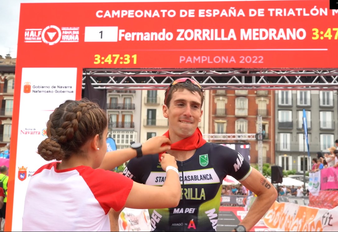 El zaragozano Fernando Zorrilla (Stadium Casablanca Mapei) se ha impuesto hoy en el Campeonato de España de Triatlón Media Distancia 2022 disputado en Pamplona, firmando una de las actuaciones más brillantes de su carrera deportiva y de la historia del triatlón aragonés. Desde hace varias temporadas, Fernando Zorrilla se ha confirmado como uno de los más temidos y mejores triatletas élite nacionales. Su actuación en el Half Triatlón de Pamplona, que se ha disputado en las distancias 1,90 kilómetros de natación, 85 kilómetros de ciclismo no drafting y 19,50 kilómetros de carrera a pie, le permite ya ser una de las referencias más importantes del triatlón español. Además, se trata de un triatleta que brilla en varias disciplinas ya que, a la medalla de oro obtenida hoy en Triatlón MD, se suman las de bronce en Triatlón de invierno, o del campeonato de España de Duatlón en 2021. El triunfo de hoy en el nacional de Media Distancia le otorga billete para el Campeonato de Europa de Triatlón MD que se celebrará el 24 de septiembre en Bilbao, por lo que seguirá sumando participaciones internacionales con la selección española de triatlón.